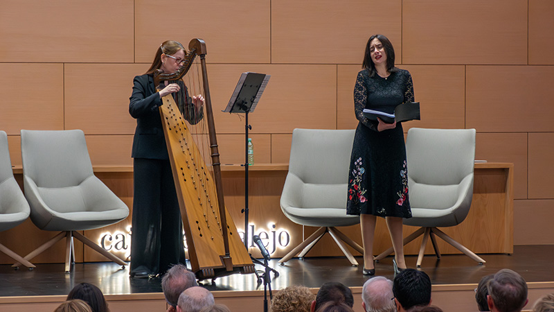 La sesión finalizó con el programa musical que suele acompañar las inauguraciones del curso académico, en esta ocasión con la participación de la soprano Dña. Delia Agúndez, Académica correspondiente de la RAEX, acompañada por Dña. Laura Puerto al arpa ibérica de dos órdenes, para interpretar varias canciones del repertorio clásico y de la tradición extremeña.